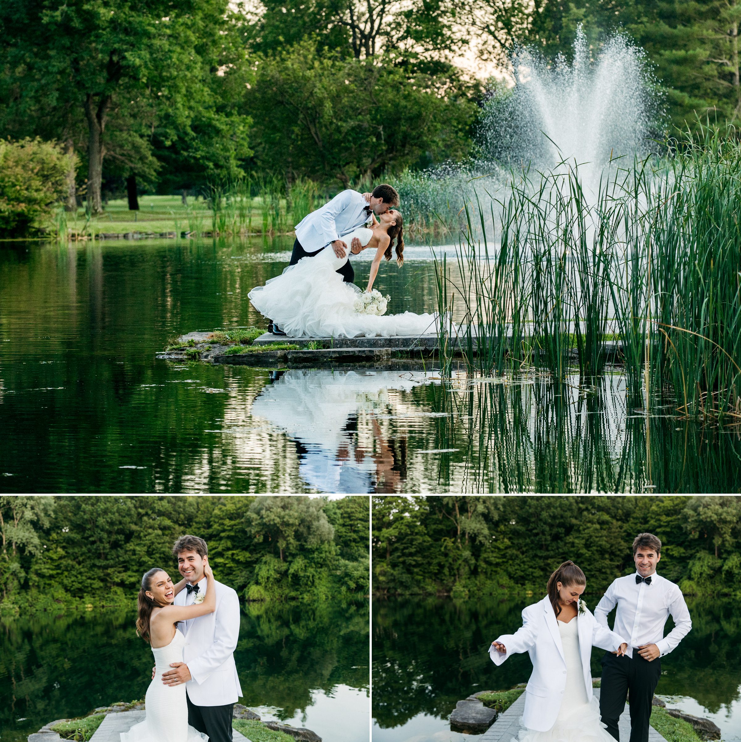 This gorgeous couple celebrated their day in true fairytale fashion. From their first portraits under the tall trees to a playful stroll by the lake, every part of their wedding day radiated joy and elegance. The groom’s classic white tux paired with the bride’s flowing gown made for a striking look that popped against the natural landscape.